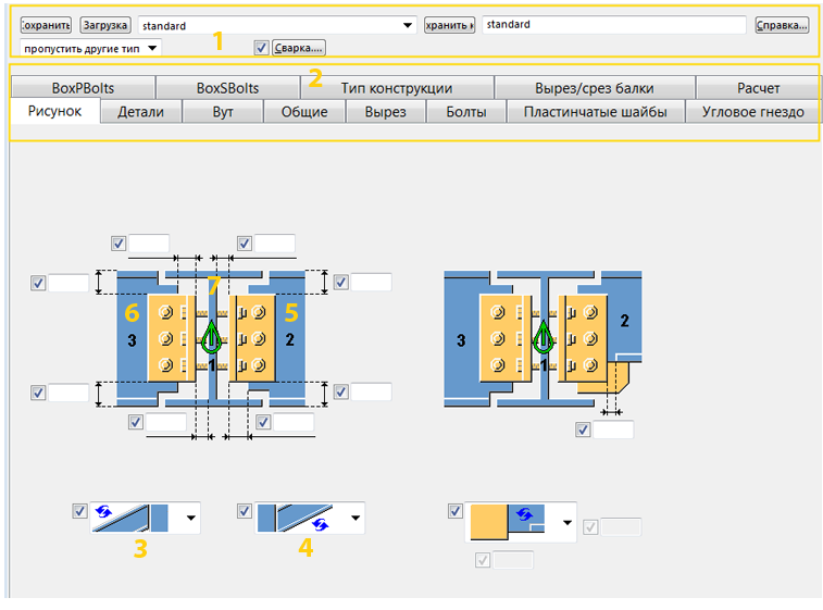 В верхней части диалогового окна можно сохранять и загружать предварительно определенные настройки. В некоторых компонентах имеются кнопки для доступа к болтам, сварным швам и свойствам DSTV.