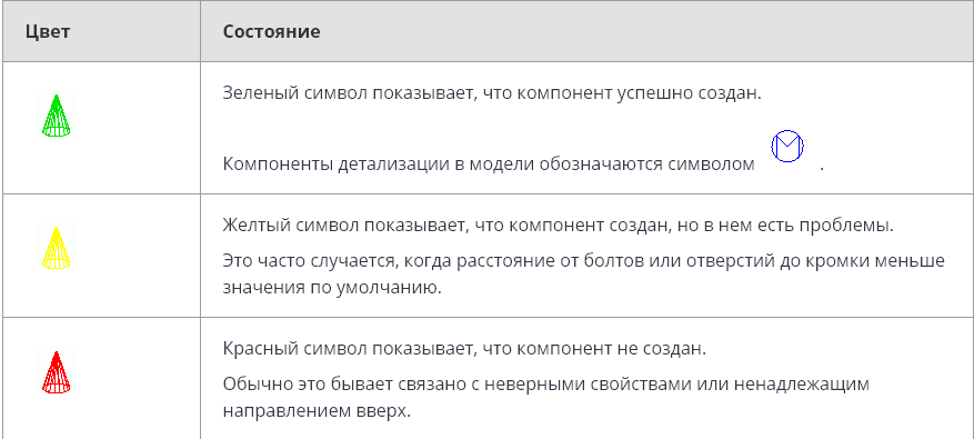 После добавления компонента Tekla Structures показывает состояние компонента с помощью символов, приведенных в таблице ниже. Дважды щелкните символ, чтобы открыть свойства компонента.