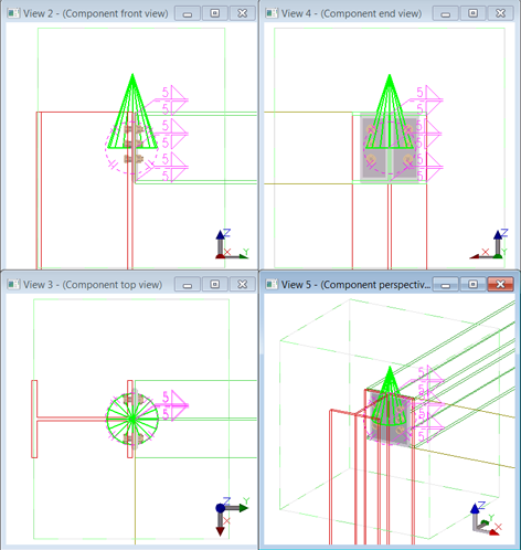 Tekla Structures создает четыре вида: спереди, сверху, сбоку и в перспективе.