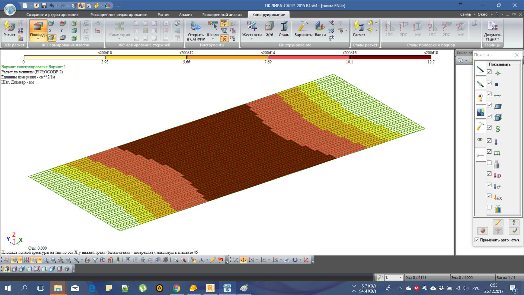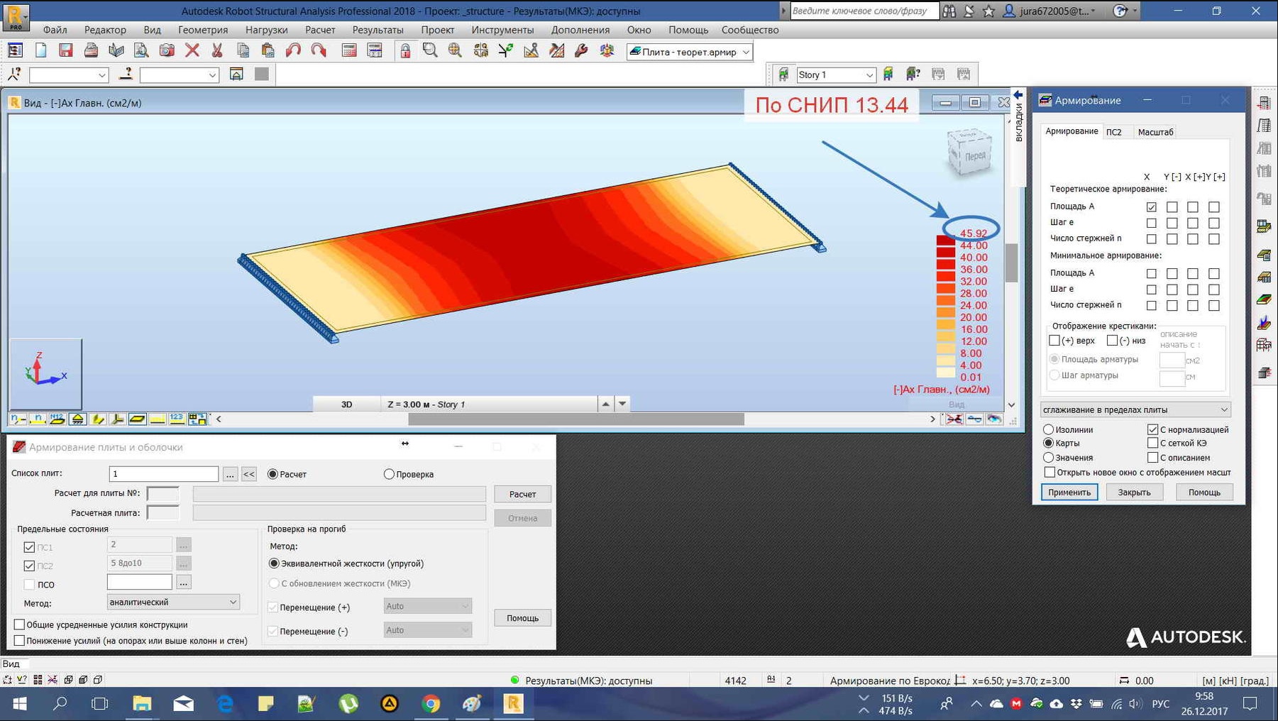 Разница в расчётах по снипу и еврокодам в лире есть, но в принципе допустима и вполне объяснима (15.7см2 и 12.7см2 максимальное армирование в центре плиты), и даже почти совпадает с расчётом в роботе по снипу (13.44см2), RFEM тоже показал похожий результат 12,29 см2 (результаты и картинки в архиве), но вот при расчёте в роботе по еврокоду армирование уже 45.92см2 , что уж точно не похоже на настоящее. Может кто встречался с такой проблемой? :shock: :shock: