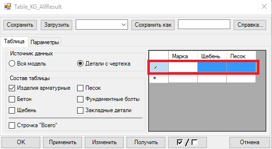 Например, в таблице присутствует марка К1, в поле марка мы пишем «К1» и ставим объем песка