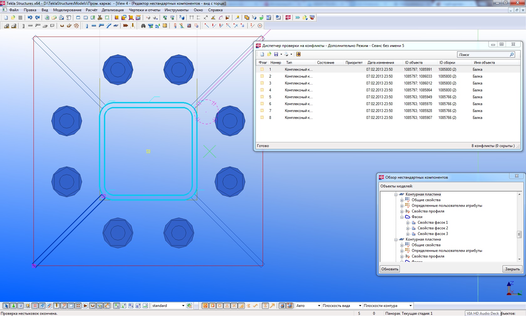 Согласно этому узлу пластины крепятся к закгрулениям в трубе. Делаю показать деталь точными линиями и подвожу фасонки. при проверке "Диспетчер на конфликты" выходит ошибка, как выйти из ситуации.