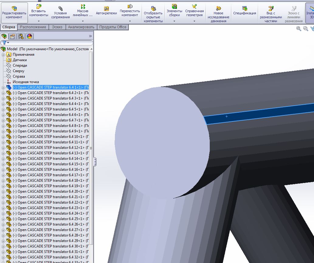Сам файл .iges с трубами нормальный не получается. Солидворкс ничего не показывает, SpaceClaim показывает в виде множества поверхностей. Двутавры (с прямолинейной осью) передаются солидами, но без радиусов закруглений.