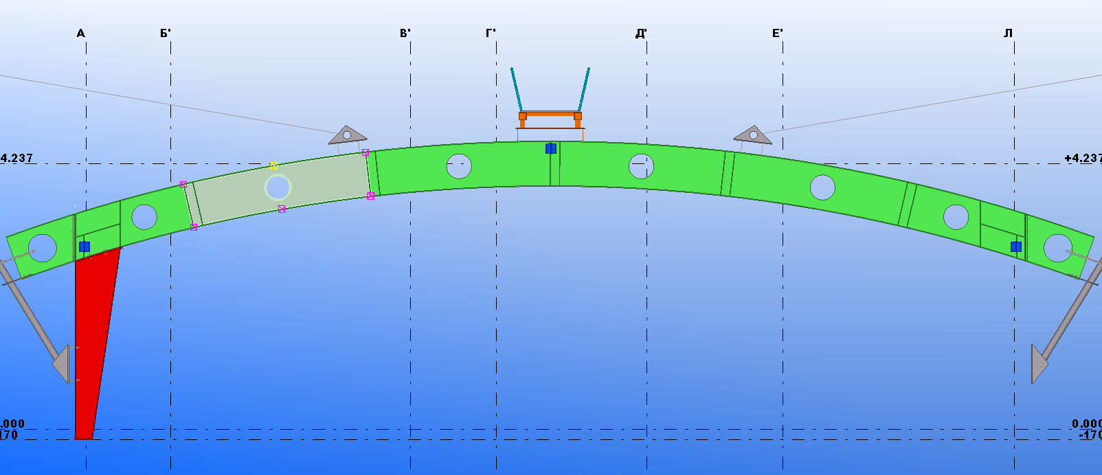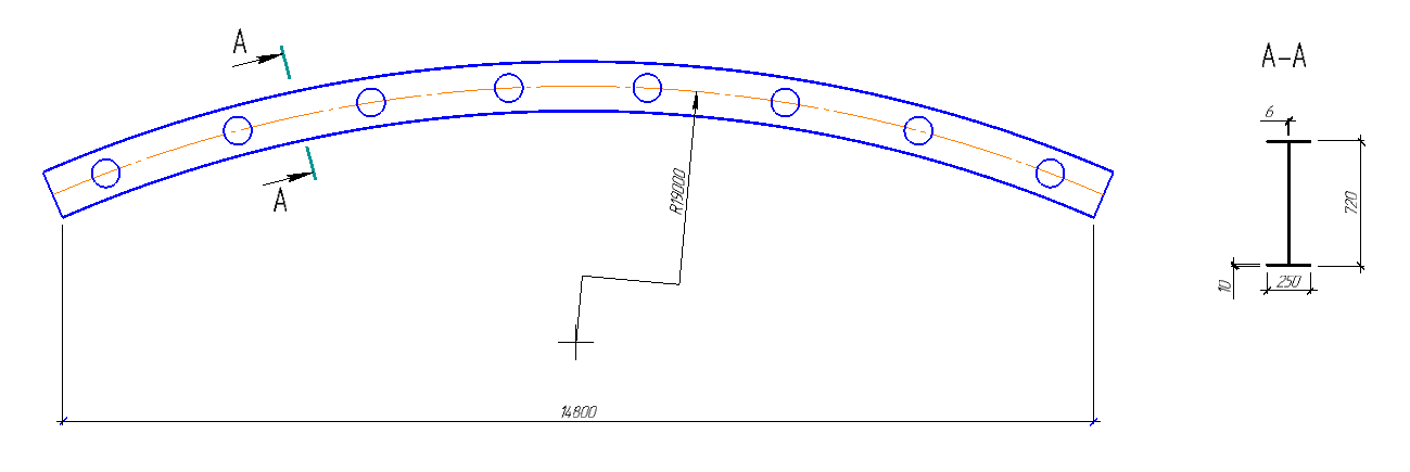 Вот недавно сделал что-то похожееAntonio писал(а):Аналоичный вопрос: стоит задача сделать чертежи на сварные балки со строительным подъемом. суть проблемы: строительный подъем 33 мм. на 10-12-ти метровых балках, радиус ооочень большой 200-260 метров. решить задачу было решено применением "криволинейной балки", но возникла проблема со стенкой: в спецификации ее ширина учтена как конечная ширина заданная в параметрах балки при ее создании, но ведь "кривую" будут вырезать из нормального листа, который имеет размер на 33 мм. больше (на величину строительного подъема). как результат перевод в автокад и исправление чертежа и спецификации там, что мягко говоря не удобно. попробовал создать балку контурной пластиной или обрезать прямоугольную деталь многоугольником, но ничего не получилось. подскажите, как правильно создать такую балку?