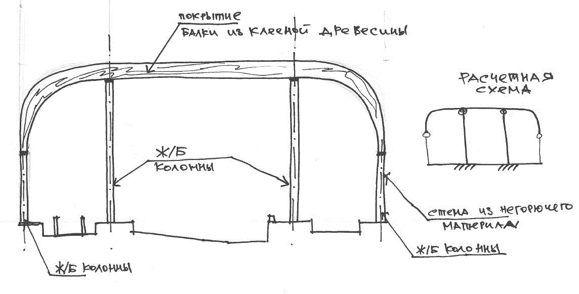 Размер рамы 56 метров. Гнутая часть будет изготавливаться из дерева. Радиус загиба - 5 метров, сечение изогнутой части от 400X360 до 1950*360.