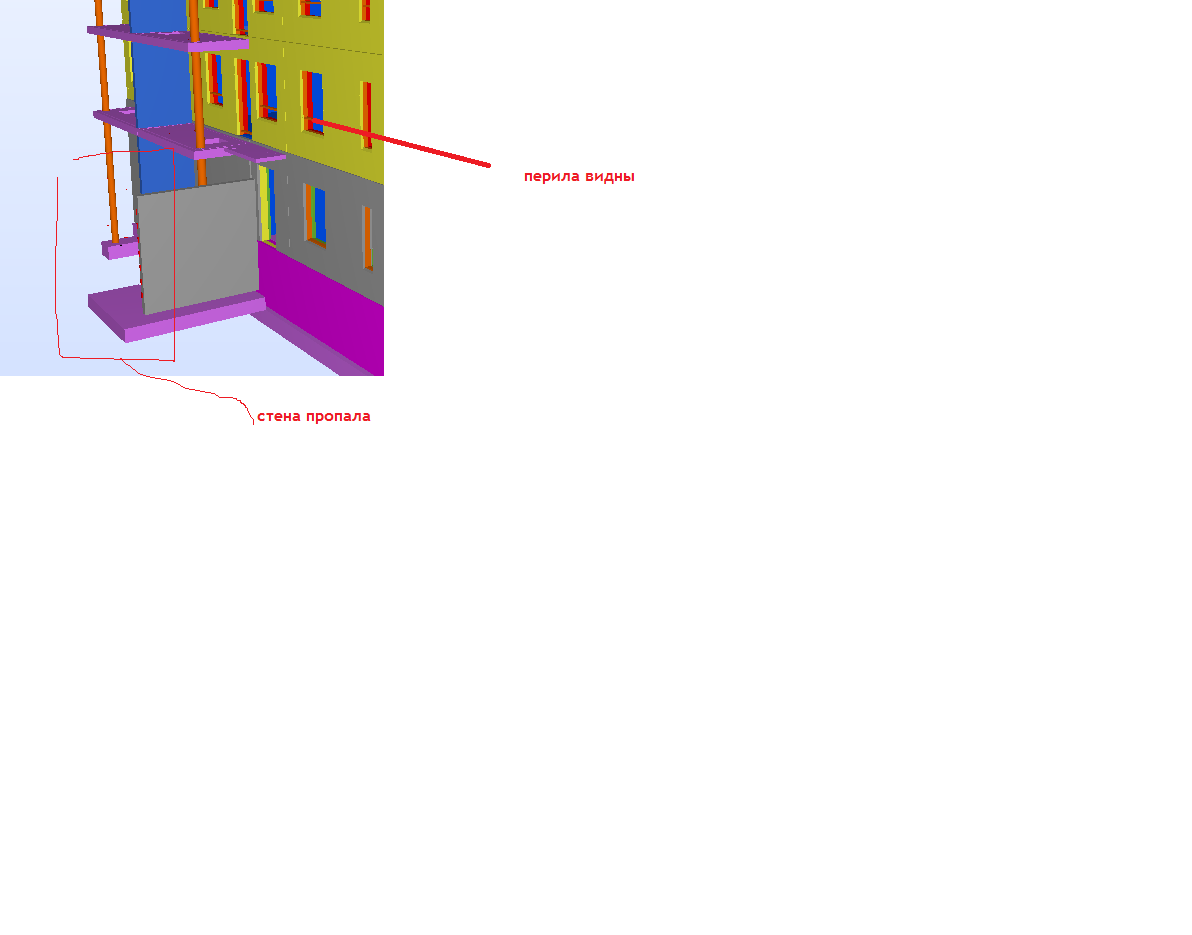 Объекты при экспорте выделяю рамкой слева направо. Однако в IFC модели эти перила видны, и пропадает полностью армированная стена, из кот. выпусти в фундамент.