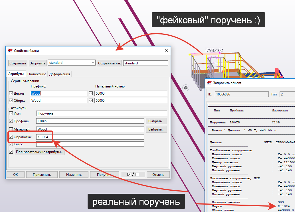 мы не будем выводить номера деревянных марок, для них у нас будет всего три марки - поручень, заполнение и отбойник. Мы берем номера из смоделированных длинных хлыстов и вписываем для всех деревяшек, например, в обработку. И на чертеже мы выводим в качестве марки уже обработку, именно для этих деталей ограждения. На всех чертежах поручень будет иметь одну марку, нам не важно какой у него номер, мы сами ему присвоили нужную нам маркировку. Способ, который описываю, как раз подходит любому, потому что доработка шаблонов не требуется. Пилить свой шаблон дело хорошее, но я считаю ненужными действиями объединять в сборку элементы ограждения, это отнимает время, а значит нужно отказываться от такого способа.