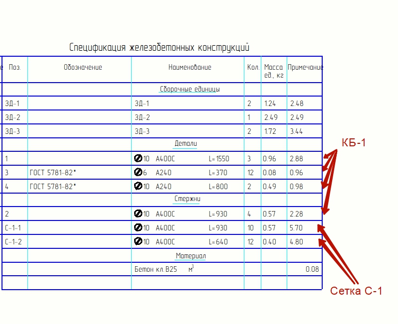 Как сделать спецификацию на такой элемент, чтоб в таблице были все сетки ( и ЗД) и армирование самого елемента (КБ-1)?