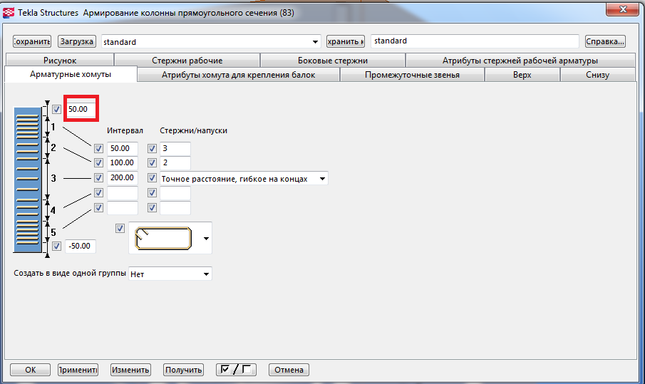 Проектирую давно, но за TEKLA сел только сейчас. Делаю ж.б. подколонник столбчатого фундамента. Использую элемент 83 - армирование колонны прямоугольного сечения. Пытаюсь сделать хомуты и шпильки с одинаковым шагом. Если выделенный красным размер сделать 0, то шаг совпадает, в остальных случаях нет. Может кто знает в чем дело?