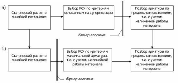 При расчете конструкций с использованием РСУ, которые основаны на принципе суперпозиции, всегда имеется противоречие: статический расчет ведется в линейно-упругой постановке, арматура подбирается на основе предельных состояний, т.е. с учетом нелинейной работы материала. И этот алогизм всегда будет присутствовать вне зависимости от способов составления РСУ (рис. 1). Выбор РСУ по критериям максимальной арматуры очень энергозатратен в смысле затраты машинного времени.