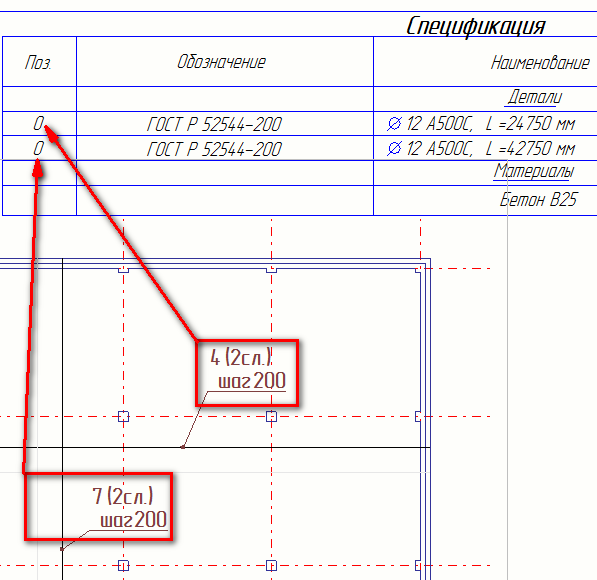 Выполнил армирование плиты с помощью группы стержней. Создал чертеж общего вида, проставил метки армирования, вывел спецификацию-КЖ отлитый элемент типовой, получил в таблице позицию -0 в метках 4 и 7. Что я делаю не так?