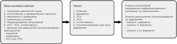 пользователя с возможностью 3D-визуализации расчетной схемы на всех этапах синтеза и анализа. Мощная система диагностики. Многочисленные виды представления результатов решения задачи — в графическом (изополя, эпюры, деформированные схемы, анимация форм колебаний) и табличном (перемещения, напряжения, усилия, РСУ, РСН, результаты подбора арматуры в железобетонных элементах и сечений стальных элементов) позволят быстро провести необходимый анализ. Режим вариантного проектирования — в одной задаче пользователь может варьировать сечениями элементов, материалами, нормативами.