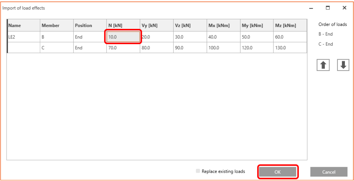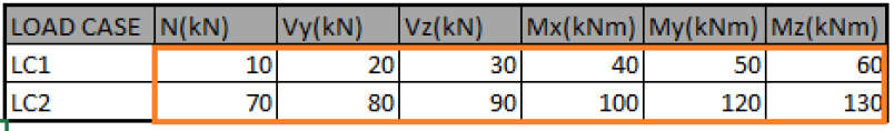 В IDEA StatiCa загружения могут быть экспортированы из заранее подготовленной таблицы Excel. Для корректного импорта порядок элементов в таблице, как и внутренние усилия и их величины, должны соответствовать проекту в IDEA StatiCa. Скопируем усилия из таблицы Excel (горячие клавиши Ctrl + C).