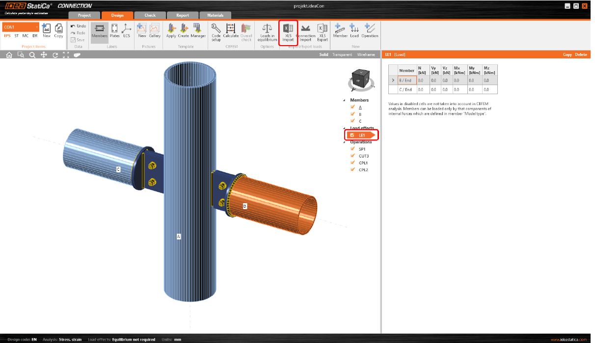 В IDEA StatiCa Connection выберем существующее загружение и нажмём на кнопку XLS Импорт на главной ленте.