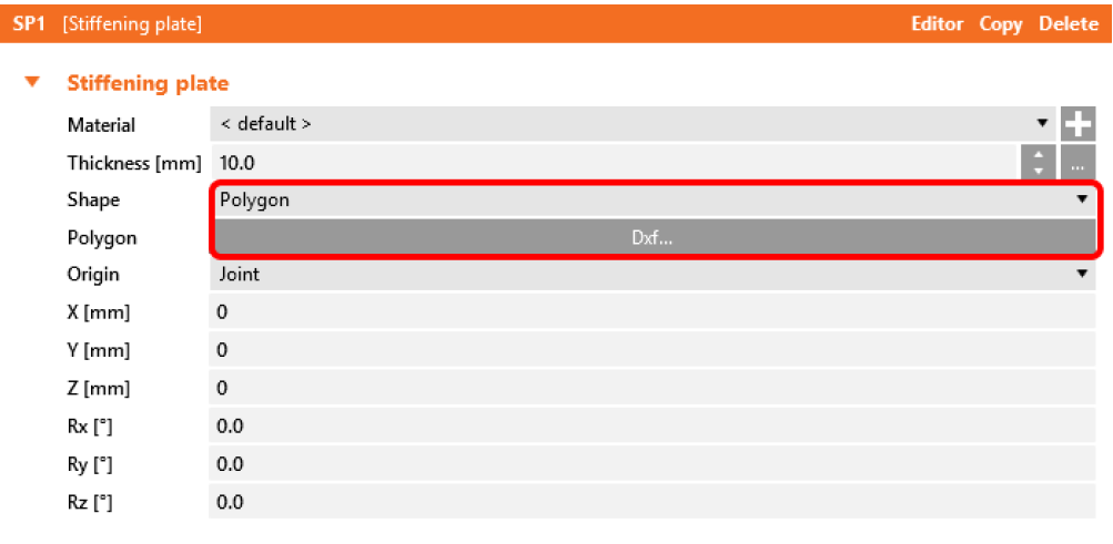 Создадим новую Пластину усиления и в свойстве форма выберем Многоугольник. Теперь мы можем воспользоваться командой Dxf для импорта пластины из чертежа формата *.dxf.