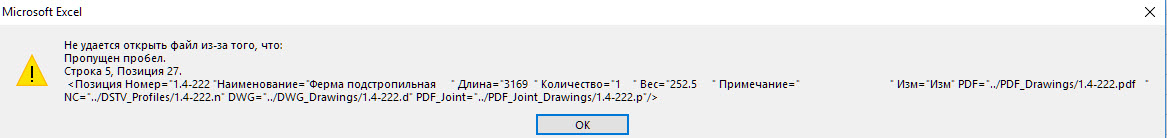 Добрый день! Есть проблема при создании отчета КМД21 (ведомость прокатных деталей). После его создания - отчет не открывается и Excel выдает ошибку про какойто пропущенный пробел