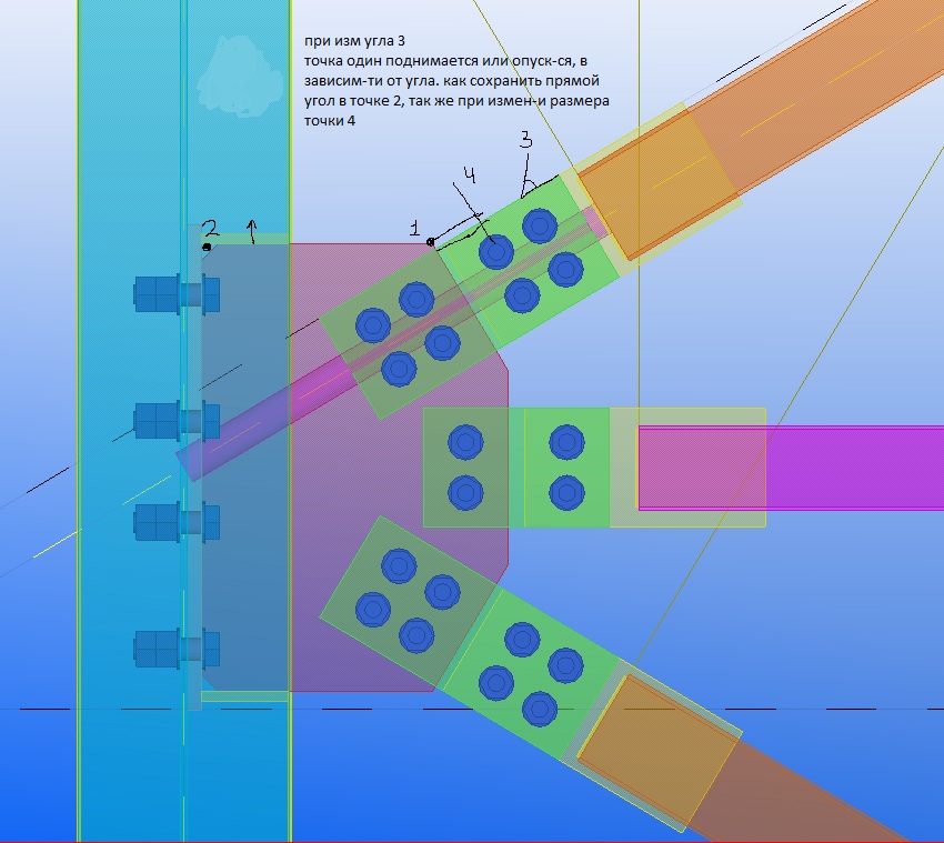 тебе нужно размер до точки 1 по вертикали получить через математику потом размер до точки 2 приравнять с размером до т.1Арсен А. Э. писал(а):еще такой вопрос, замарочился узлом связей. прикрепляю картинку, подскажите как выйти из положения.