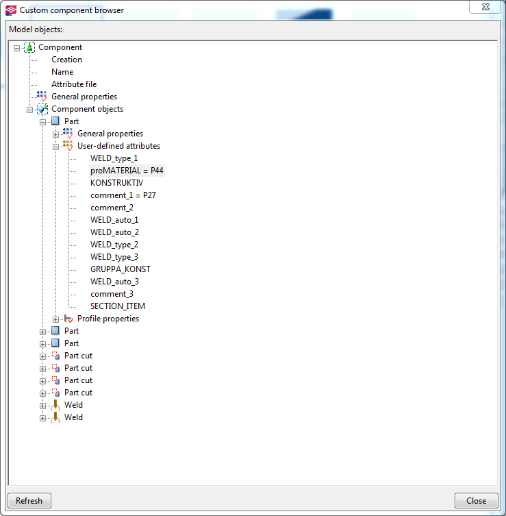 Предпологаю, что причина может быть в создании компонента в старой версии Tekla (работаю в 17-ой), и при этом используется такой странный пользовательский атрибут, как "proMaterial", при этом в пользовательских атрибутах детали его нет, а в дереве компонента есть: