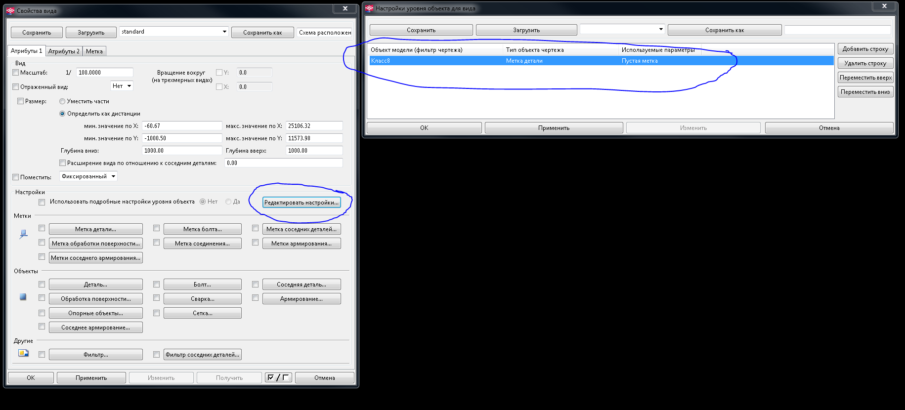 Итак, заходим в свойства вида, жмем фильтр, создаем фильтр, сохранем его. На изменить и прочие кнопки не жмем Дальше сохраняем пустую метку для детали, также из свойств вида Заходим в "Редактировать настройки", создаем строку и настраиваем как на картинке. Тут жмем наконец-то "Изменить", предварительно выбрав нужный видcowperwood писал(а):Добрый день...