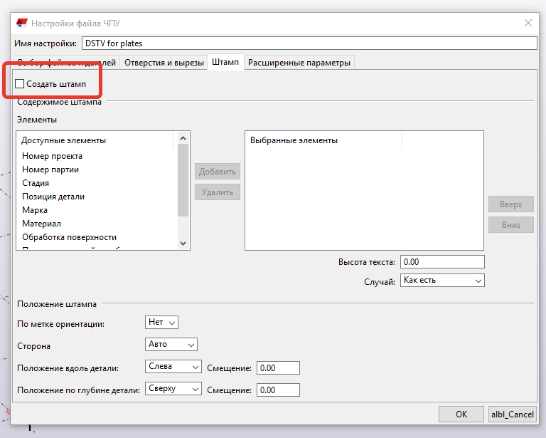 Если этот расширенный параметр установлен в значение TRUE, в файлы DSTV включаются штампы для главных деталей и всех видов второстепенных деталей. Если он установлен в значение FALSE, штампы создаются только для главных деталей. Значение по умолчанию — FALSE.