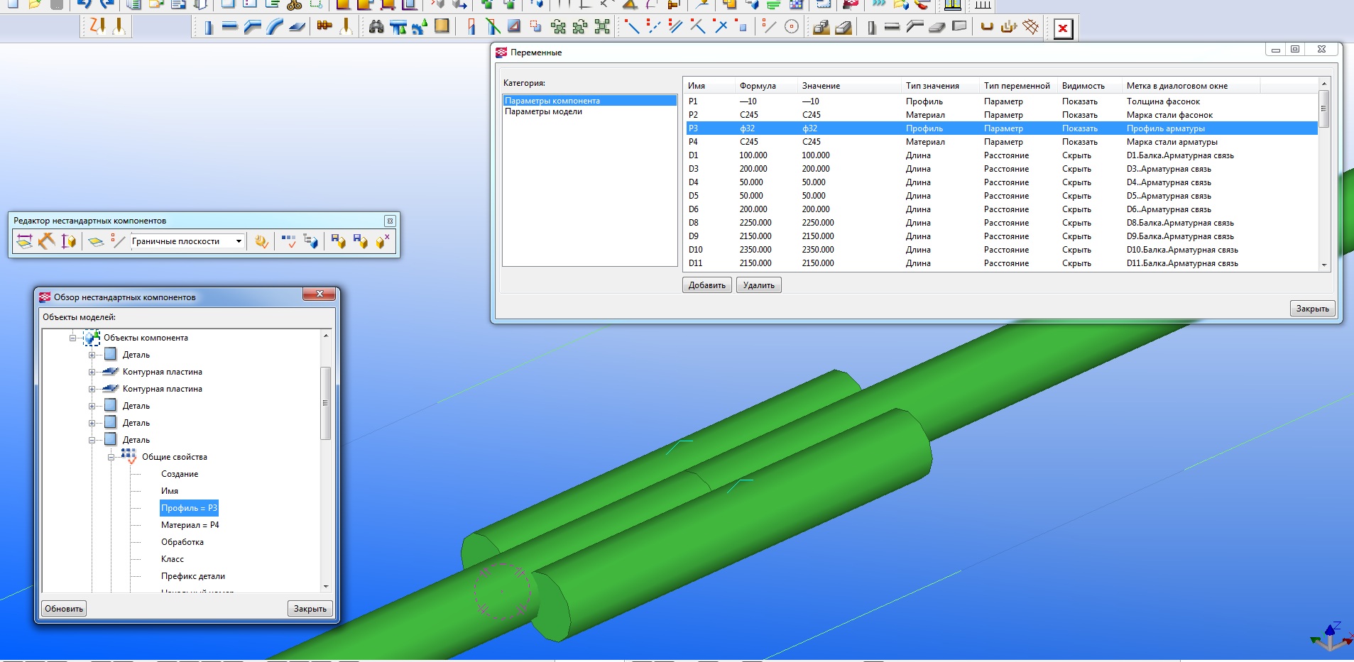 Должна получиться связь. Вся связь сделана компонентом - детальТаран Д. А. писал(а):Есть чертеж того что надо получить?troy-47 писал(а):Здравствуйте, подскажи, создаю пользовательский компонент соединения арматурных стержней. при смене профиля арматуры остаются зазоры между коротышами и основными деталями, как правильно их привязать что бы зазоров не было при изменении профилей?