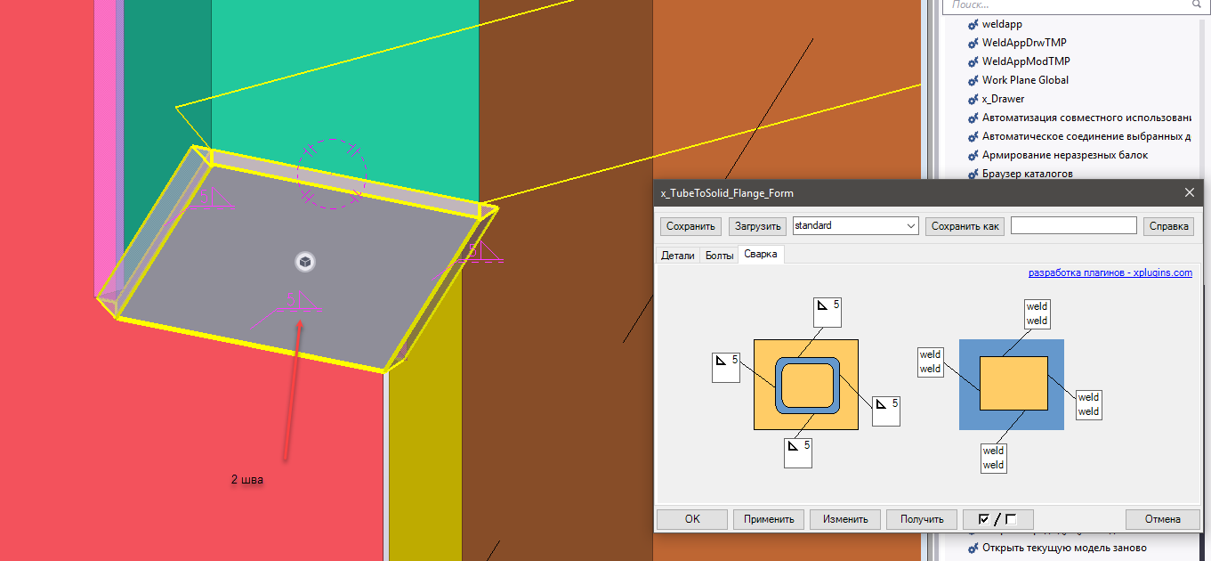 Выложил небольшое обновление узлов x_plugins, исправлены некоторые ошибки, изменен процесс постановки сварки - в тех местах где это возможно сварка ставится с двух сторон, как следствие, на чертежах реснички рисуются ВелдАпом тоже с двух сторон.
