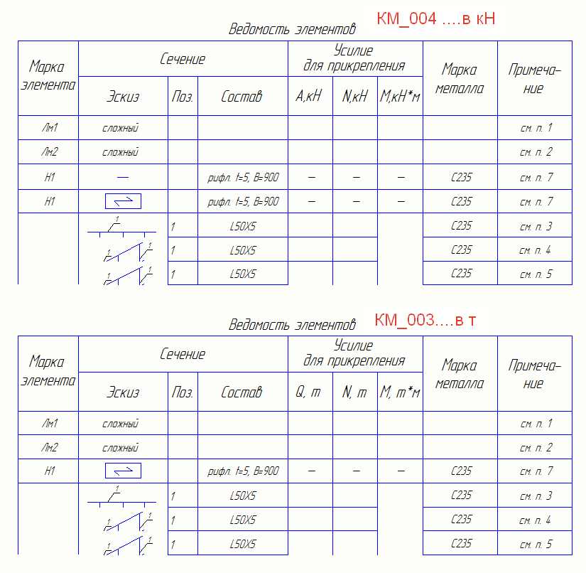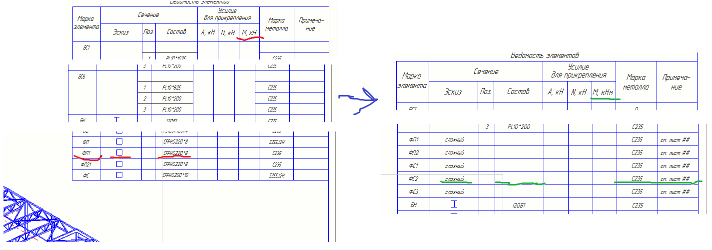 Приветствую! Столкнулся с невозможностью реализовать строчку таблицы ведомости элементов по ГОСТ для ферм: карт1., с помощью G_G_Ведомость_элементов_tonna.tpl или G_G_Ведомость_элементов_kN.tpl - на листах, для ферм. Выходило что ферму описывало как её главный элемент. (Таблица узнавала сложные элементы только по наличию в составе деталей с номером для сложного сечения, а ещё в ..._kN.tpl - размерность момента - "кН" :) ) Я дописал чуток эти шаблоны, так чтобы сложный элемент узнавался также по марке сложного элемента (("USERDEFINED.COMPONENT_MARK") >= 1)), появилась надпись сложный, металл главной детали из "Сложного" и примечание ("USERDEFINED.assembly_comment_KM") Было - Стало: имг2 тплы новые+старые: ссылка. Алоха!