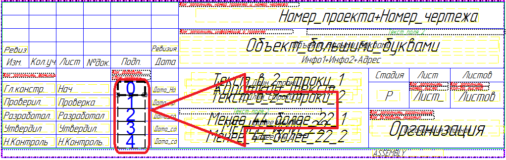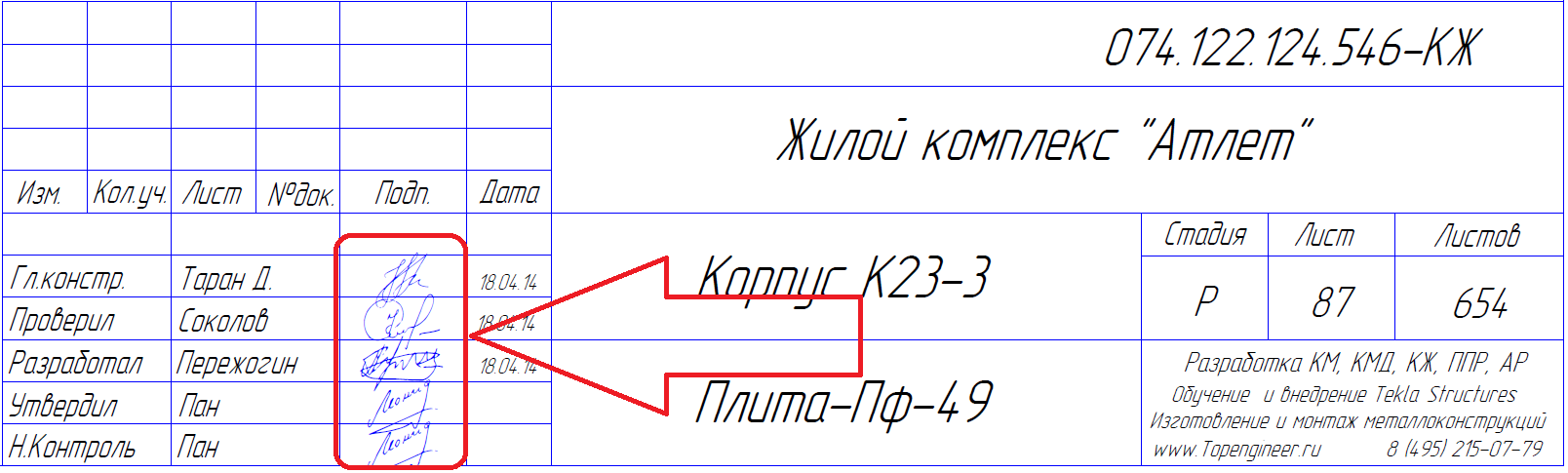 Все подписи хранятся в виде векторного шрифта TeklaStructuresFont . В штампе чертежа по условию выводится новая подпись в зависимости от фамилии