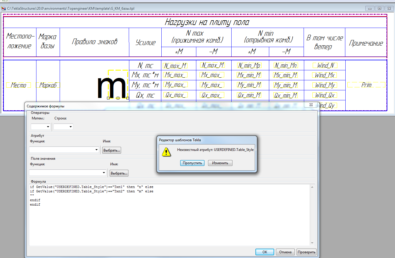 В табличке пропало изображение правила знаков. И еще- нужно поменять заголовок таблички на "Таблица нагрузок на фундамент". В темплите стоит значение "m" или "n". В шрифте TeklaStructuresFont на месте n и m стоят нужные схемы. В чем может быть дело?