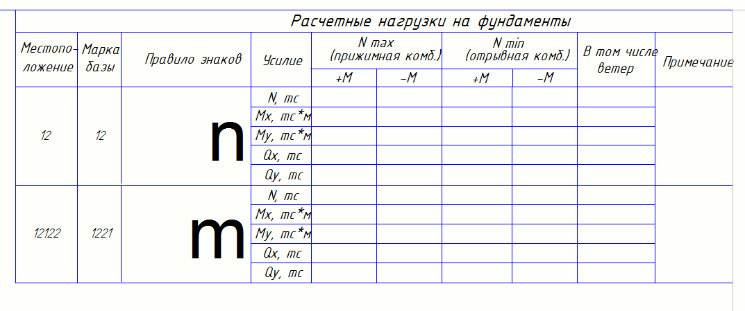Обновись.alstey писал(а):В табличке пропало изображение правила знаков. И еще- нужно поменять заголовок таблички на "Таблица нагрузок на фундамент". В темплите стоит значение "m" или "n". В шрифте TeklaStructuresFont на месте n и m стоят нужные схемы. В чем может быть дело?