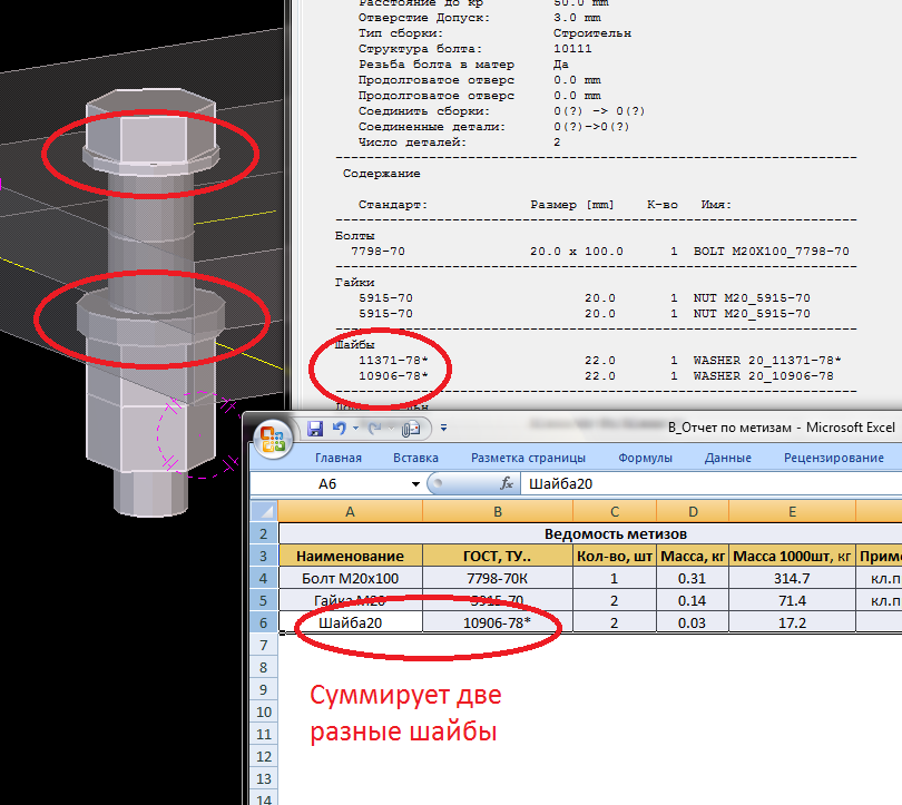 в отчете сумирует ВСЕ шайбы по комплекту, ГОСТ по той берет которая у гайки