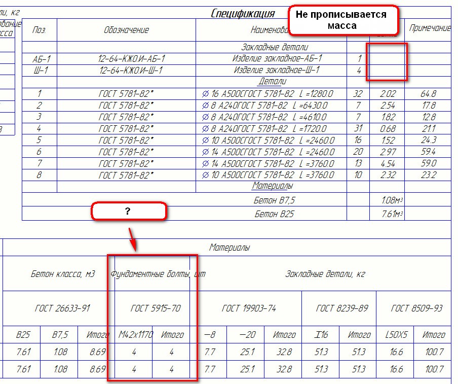 Соглашусь с вами по оформлению. Перемудрил. Разъясните, по какому принципу добавляются анкерные болты в ведомость КЖ?DrBianko писал(а):А почему масса должна прописываться и считаться? (ГОСТ21.501-2011 Приложение С)