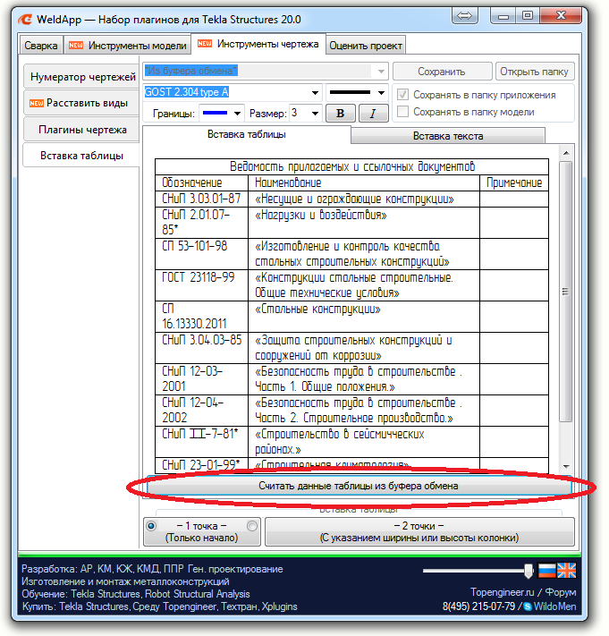 Вставка таблицы на чертеж Tekla Structures