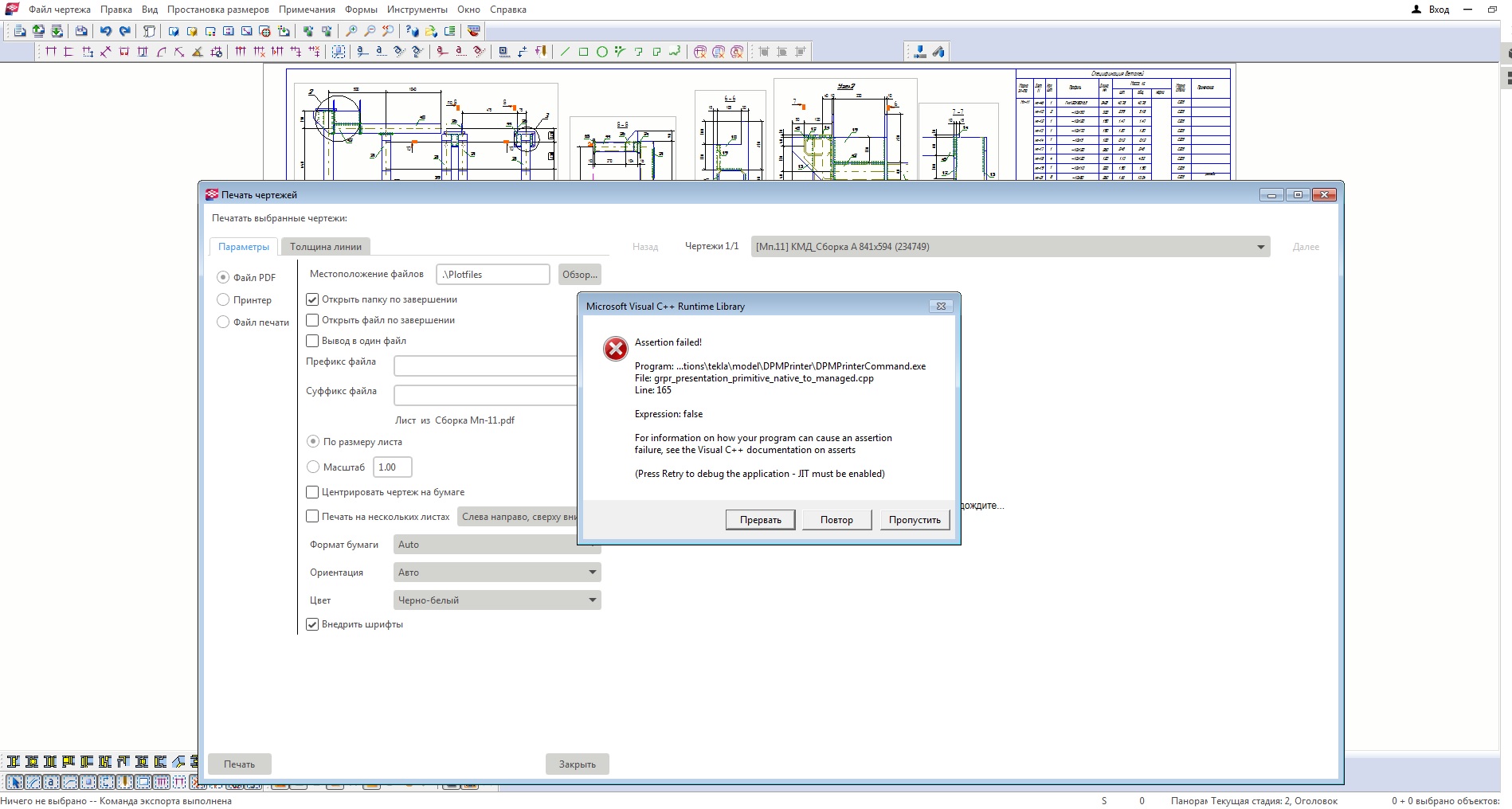 Чертежи отдельных деталей печатаются без проблем, при распечатке остальных сборок и чертежей общих видов ошибка не появляется, но перманентно с чертежей что-то пропадает.