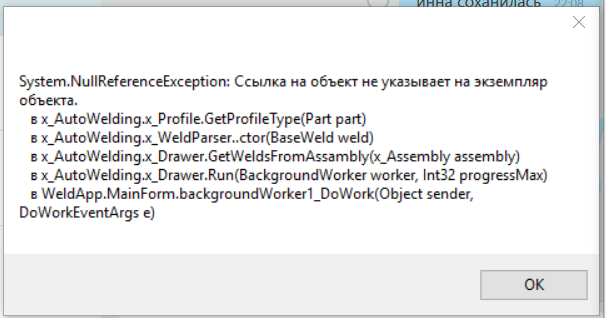да, как в первом постуObelus писал(а):Точно такую же ошибку?troy-47 писал(а):Присоединяюсь к вопросу, выдает ошибку, и не рисует сварку в чертеже
