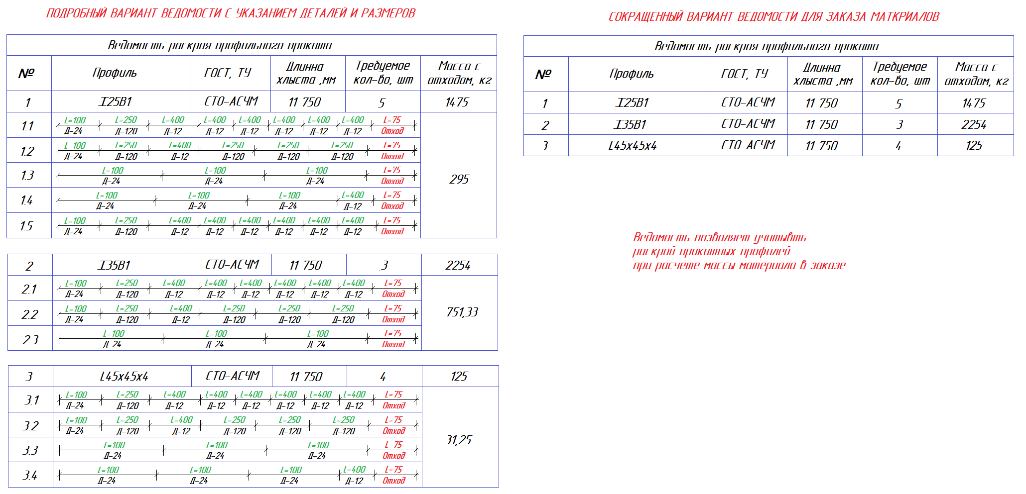 Предлога сделать ведомость в двух вариантах в простом и с указанием размещены деталей на заготовке.