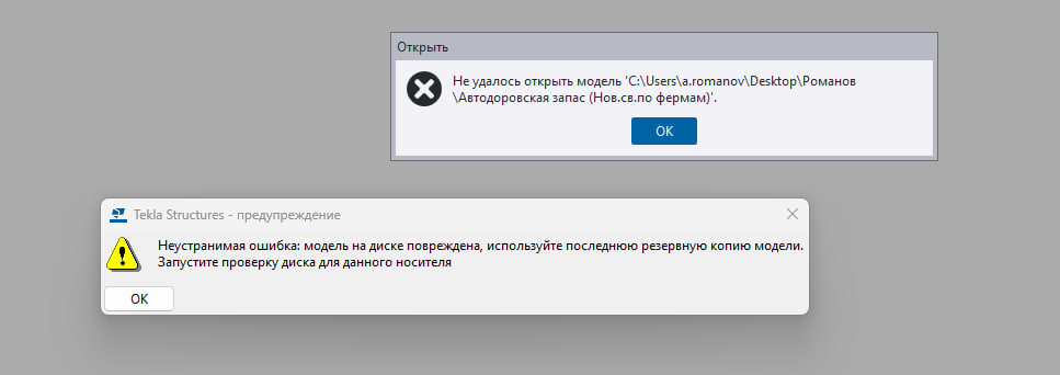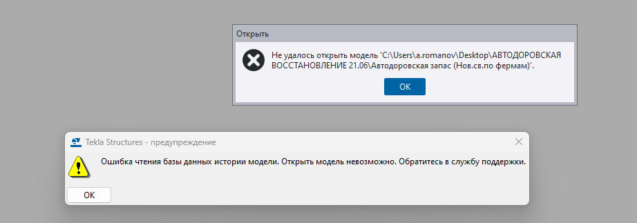 Всем добрый день! Столкнулся со следующей проблемой. В конце рабочего дня закрыл рабочий файл в Tekla. Уже с утра сама Tekla, при попытке открыть изначальную "вчерашнюю" модель (из-за чего полез в бэкап) выдала ошибку, как на скрине "Неустранимая ошибка..." и файл перестал открываться. Достал из папки "TE-Backups" автосохраненную дополнением WeldApp модель. Но при разархивировании файл history.db дал ошибку "Файл поврежден или указан неверный пароль." При попытке отдельно копировать этот же файл система выдала ошибку 0х80004005. Попытался разархивировать сторонними сервисами онлайн - что дало уже третью ошибку "Ошибка чтения базы данных истории модели". Прошу помощи... крайне не хотелось бы переделывать все заново...