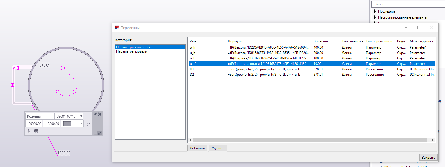 =sqrt(r * r - (hc/2 - tf) * (hc/2 - tf)) + bcbboysyndrom писал(а): ↑11 июн 2019, 09:21Как привязать трубу и швеллер друг к другу, чтобы при изменении размеров касание кромки к поверхности сохранялось?