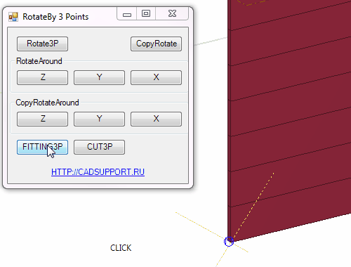 Работает так, запускаешь скрипт, выбираем объекты в модели, выбираем в панели функцию, она запрашивает три точки, по точкам первая берется как точка вокруг которой вращаем. Из двух других получаем ось вращения и угол. Потом скриптом вызывается стандартная команда перемещения/копирования, и туда все данные передаются на исполнение. Довольно быстро и удобно, и все глюки на совести Теклы. )))