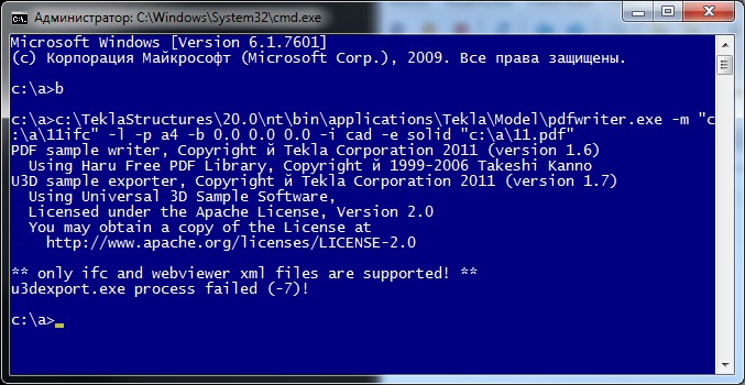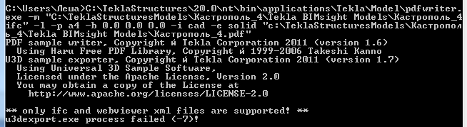 pdfwriter.exe -m "c:\TeklaStructuresModels\rotate\out.ifc" -l -p a4 -b 0.0 0.0 0.0 -i cad -e solid "C:\TeklaStructuresModels\rotate\PDF\3D-PDF-Model.pdf"Большинство проблем как мне кажется возникает с неправильно сформированным IFC файлом.