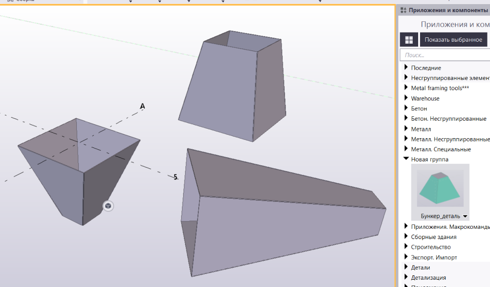 Есть же профиль PRMD, строит пирамиду. Если есть лицензия, можно скачать приложение, строит пластины по внешним граням любой детали, называется Solid2Plates Если нет лицензии, можно создать пользовательский компонент с тем же функционалом, применимый к конкретному профилю, например, к пирамиде. Сделать пирамиду профилем PRMD, смоделировать на нужных гранях листовой металл, сделать компонент типа "узел". Привязать листовье к плоскостям пирамиды, вывести толщину металла в окно компонента, чтобы можно было менять. Всё. Строите пирамиду любого размера и в один клик ставите такой компонент. Для прикидки объема отл.Рак Роман писал(а): ↑23 фев 2018, 15:09все добрый день. Поделитесь, как смоделировать пирамиду (нужно для бункера) , чтоб не строить из 4 граней, а одной командой. К примеру как усеченный конус профилем -EPD. Если такая возможность в проге?