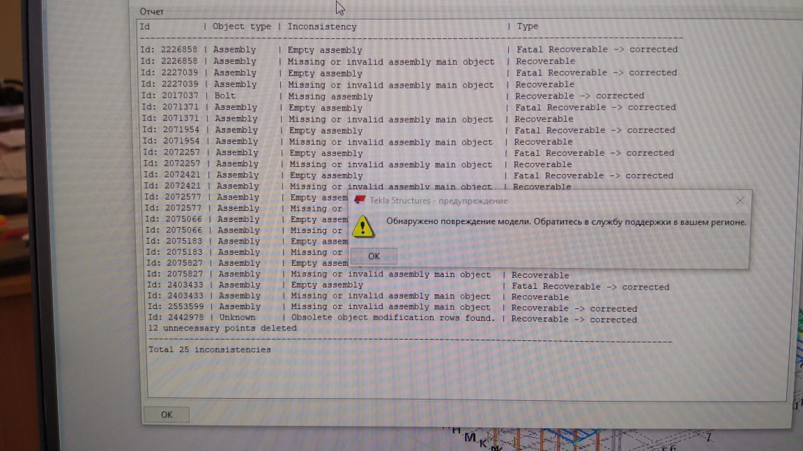 Добрый день, форумчане! При диагностике модели обнаружено ее повреждение - 24 ошибки. При проверке модели на конфликты, обнаружено 205 конфликтов.