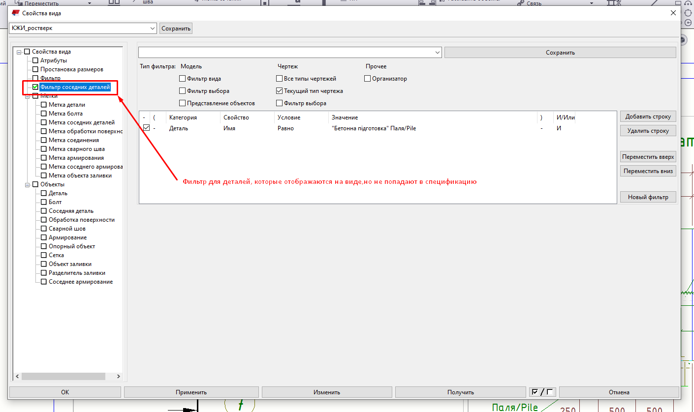 Конструкции , которые хотите видеть в спецификациях , отображаете в главных фильтрах. Те, которые нужны на виде, но не в спецификации, отображаете через соседние детали.