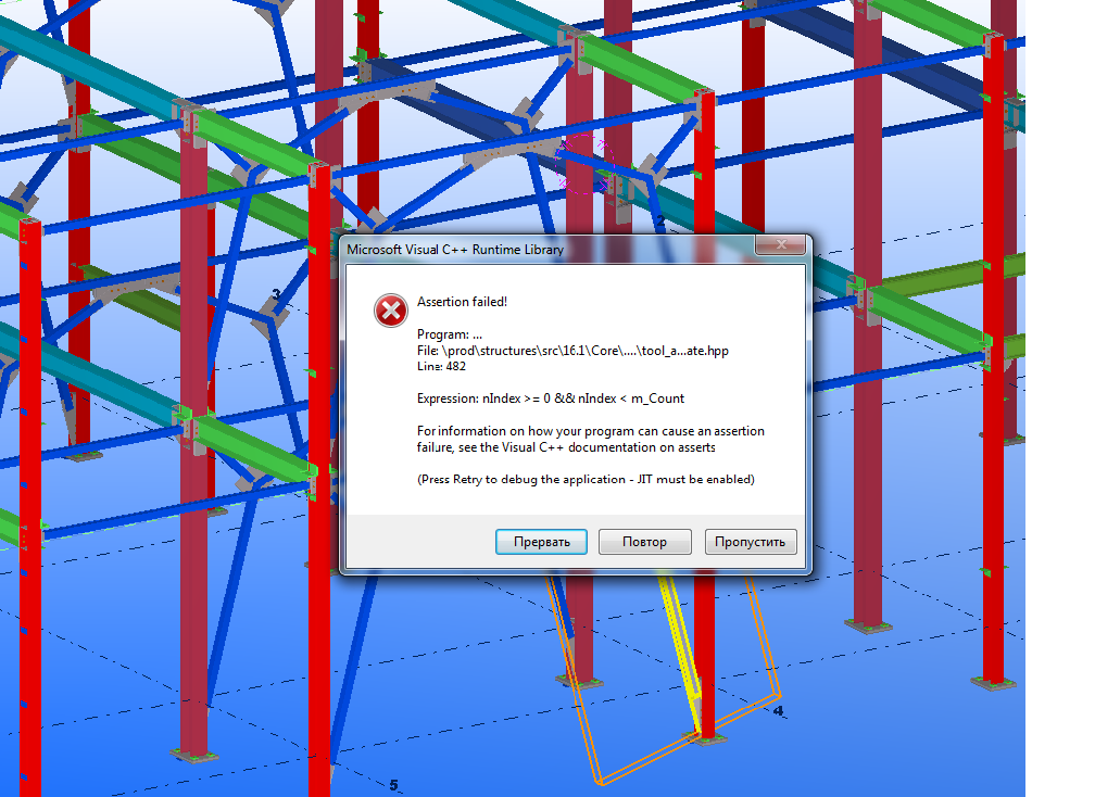 Доброго времени суток! Сделал модель, создал чертежи на колонны, отредактировал, все ОК. Пытаюсь создать чертежи на связи - выдает такую ошибку и текла вылетает... И диагностику делал, и дамп модели...не помогает. Подскажите что сделать? А то чертежи срочно надо выдавать)