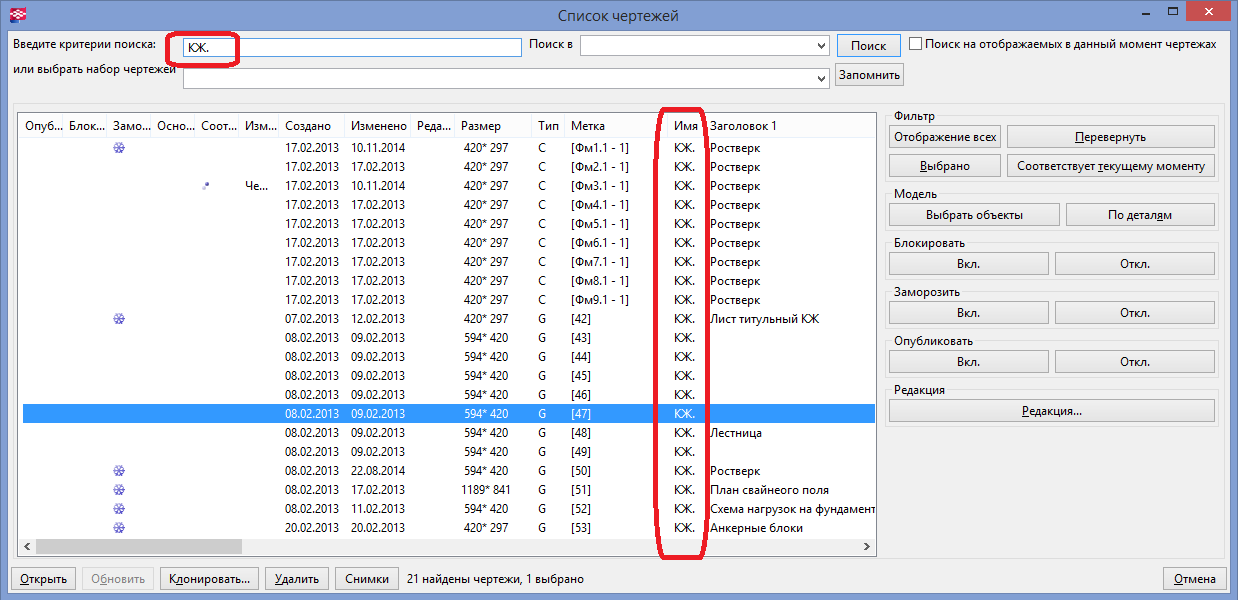 Так для фильтрации чертежей по комплекта списке чертежей достаточно ввести КМ.