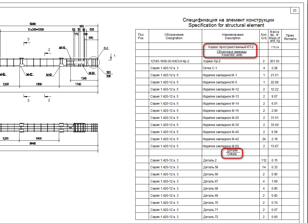 Вот есть балка. На эту балку два альбома чертежей рабочки, сама балка и внешнее армирование балки: Наш стандартный комплект чертежей, как и у всех, делится на основные и прилагаемые: Если с комплектом прилагаемых документов все понятно, по сути, это просто чертежи сборок и отлитых элементов, то вот с основным комплектом я не знаю как быть. Например вот такой чертеж узла: И вся сложность в том, что на таких чертежах в спецификации идет перечисление как сборочных единиц, так и отдельных деталей, чертежи которых приведены на этом же чертеже. На сколько реально сделать такой чертеж внутри теклы? Меня интересует не сколько нормоконтроль, сколько такие сложные спецификации.