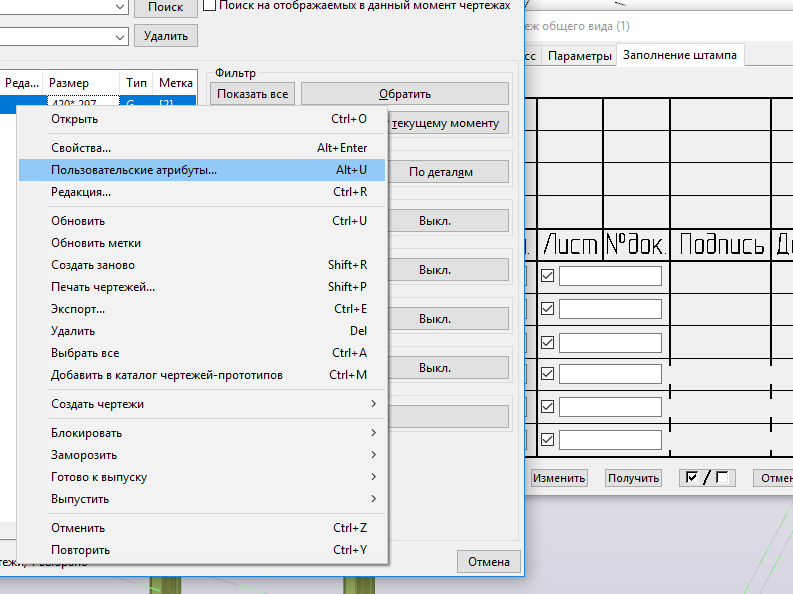 Заполнение штампа идёт через пользовательские атрибуты чертежа: