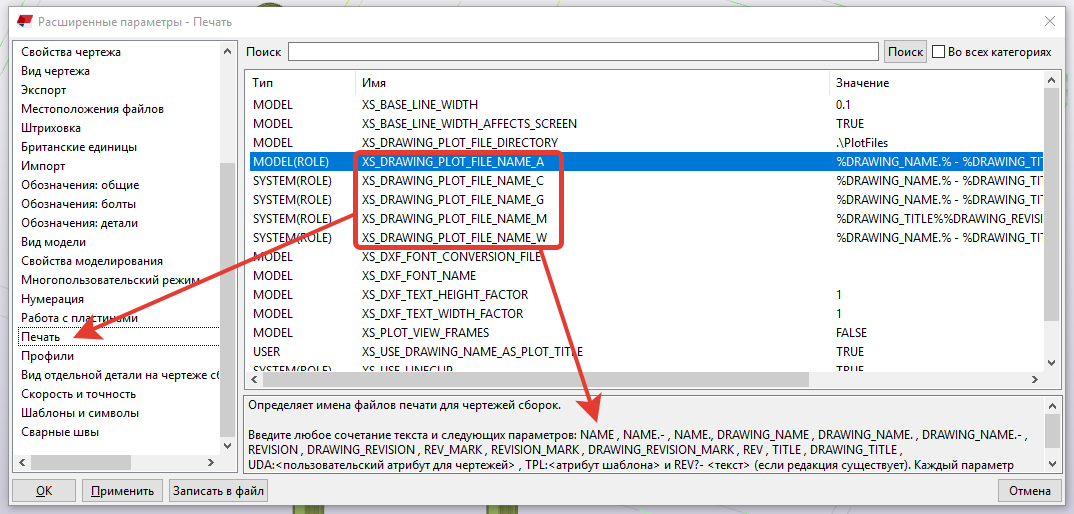 атрибуты. Настройки имен файлов при печати лежат в расширенных параметрах Ctrl+E: