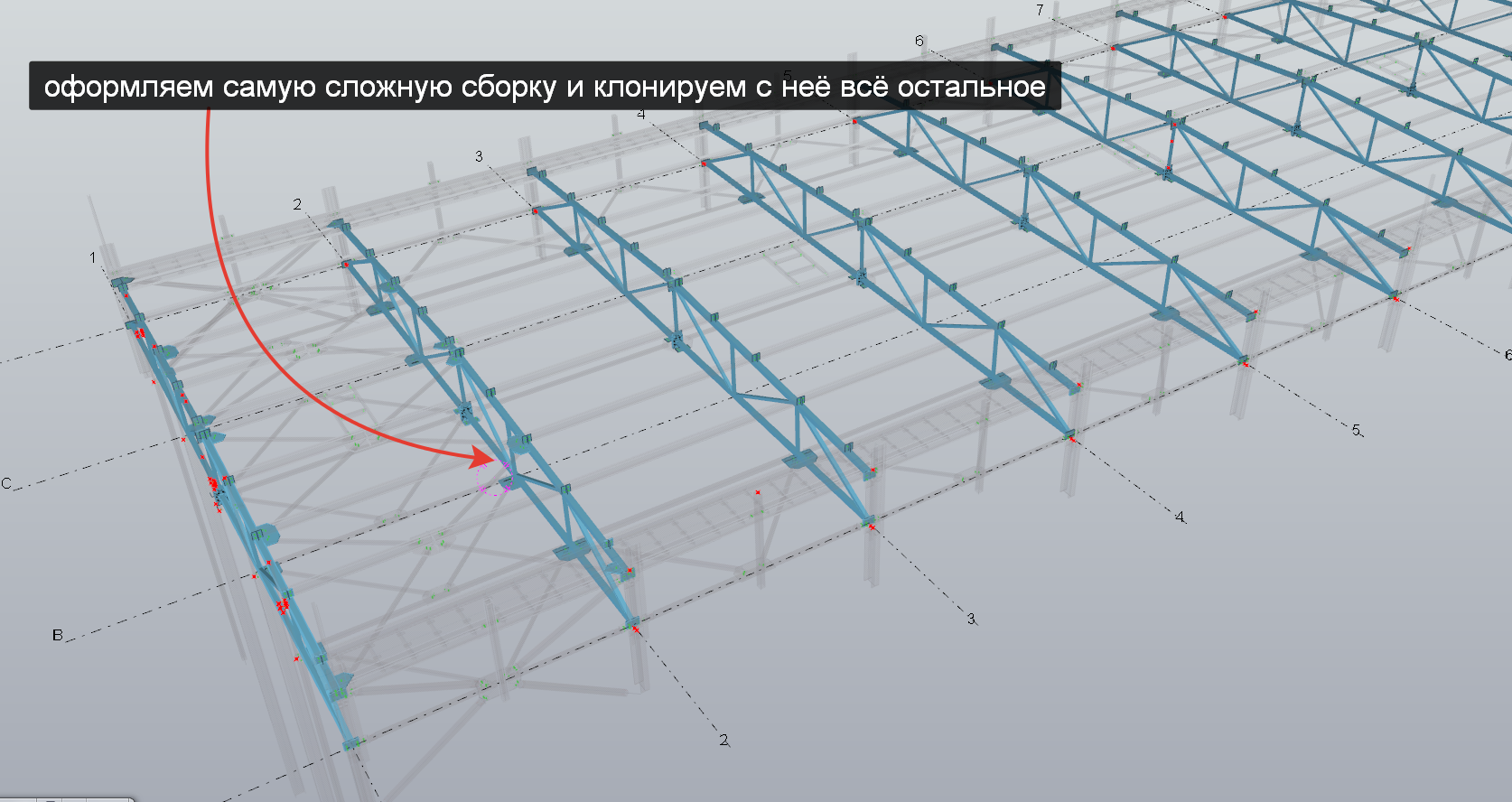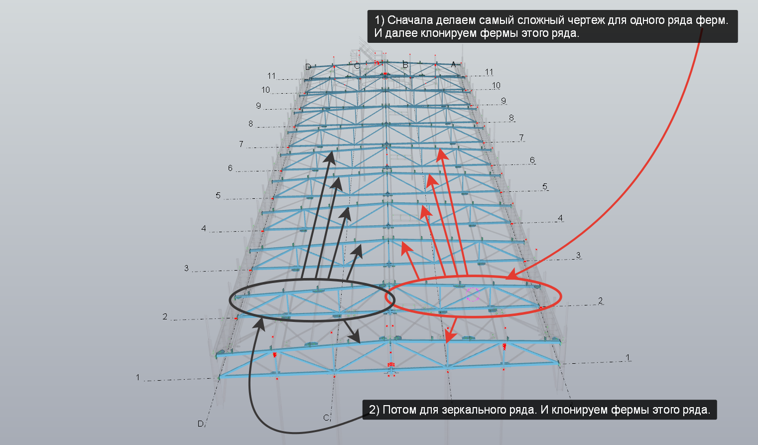 Самый общий алгоритм - делаете чертеж самой сложной сборки. Например у вас 10 ферм. Сделайте сначала ту ферму, к которой приходят связи. Т.е. ту, на которую будет больше всего видов и разрезов. И потом клонируете с неё. Тогда на чертежах тех ферм, у которых нет узлов, куда приходят связи, вы просто удалите клонированные лишние разрезы, виды, узлы.Подкажите, пожалуйста, по поводу правильности клонирования? Покопался в мануале, а также на форуме здесь, ничего толком не смог найти по клонированию Единственное, что видел, так это совет проверить ориентацию сборки в модели. А также то, что не следует зеркалить сборки, а лучше их коипровать с поворотом. Но второе уже сложно осуществимо и хотелось бы все-таки понять до конца - можно ли клонировать зеркальные сборки с минимальными доработками?