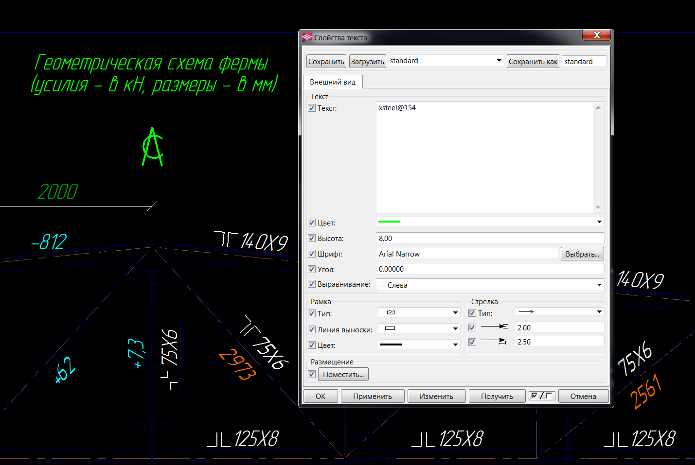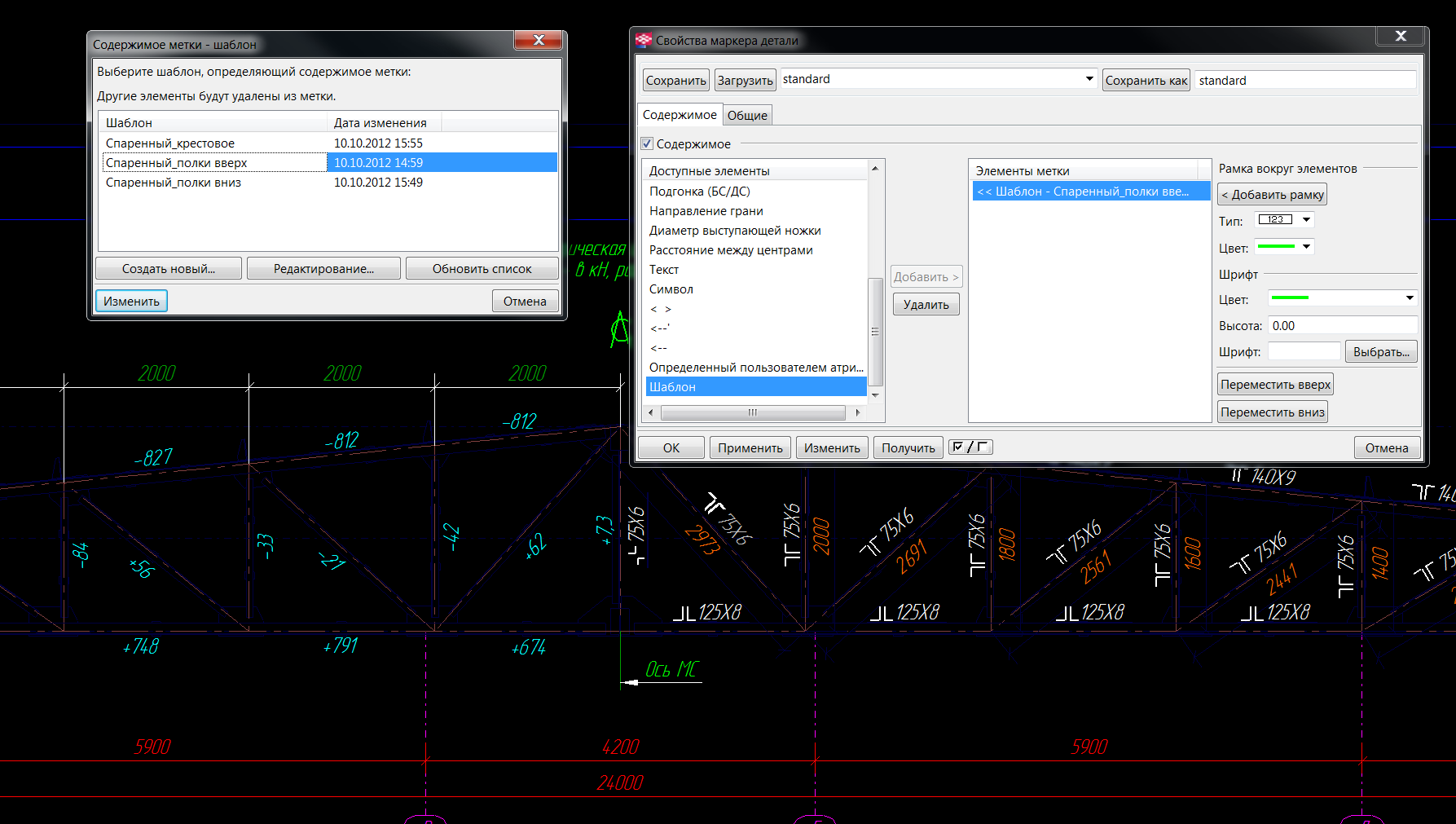 мы записываем информацию об усилиях в определенные пользователем атрибуты, затем выносками/ассоциативными примечаниями выносим в чертежи. с сечениями элементов поступаем так: если спаренный уголок, то есть шаблоны выносок, в которых подставляется знак спаренных уголков и сечение